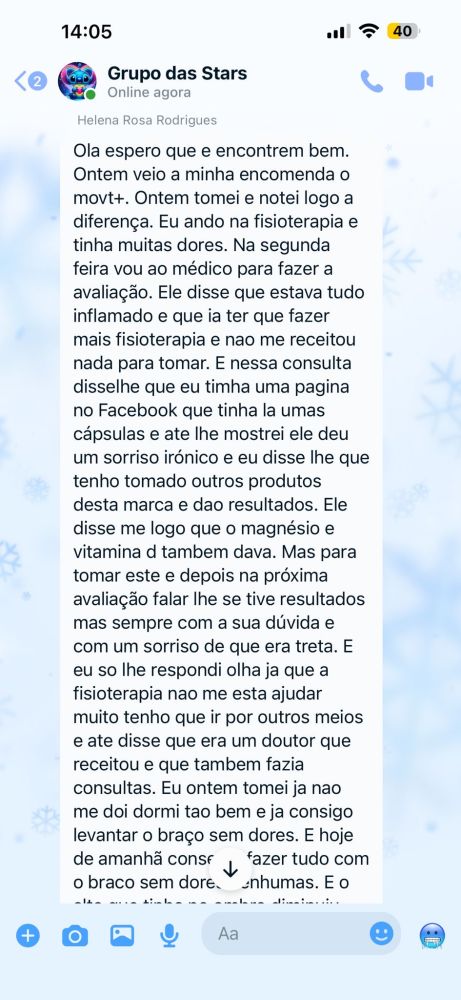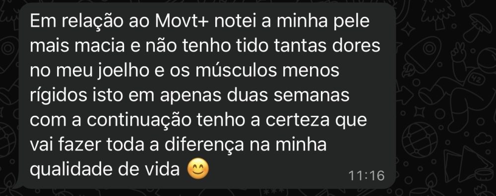 Os efeitos do Movt+ tendem a ser progressivos, sendo habitualmente observados entre 4 e 8 semanas, com benefícios mais consistentes após 8–12 semanas de utilização contínua. O uso prolongado pode contribuir para manutenção da função articular, conforto e mobilidade.
